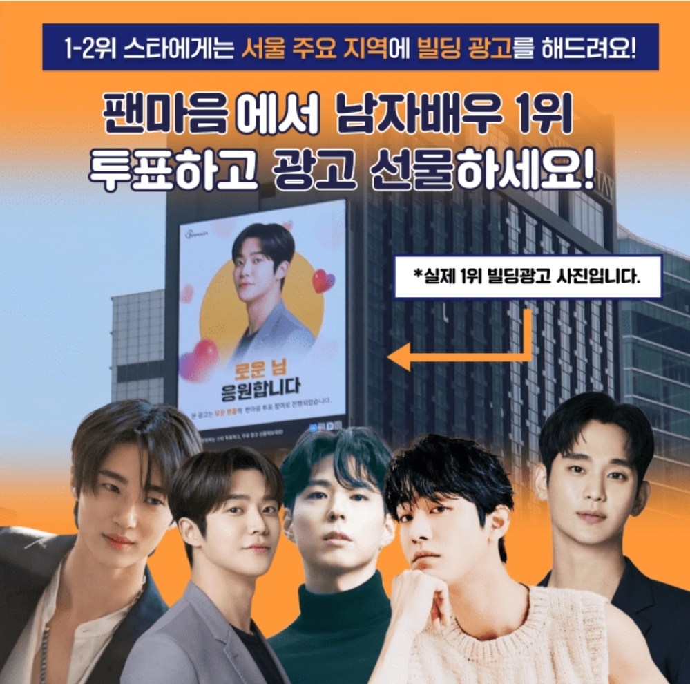 팬마음 남자배우 투표 7차에서는 대한민국 최고의 남자배우 0명에게 서울 대형 광고를 드려요!