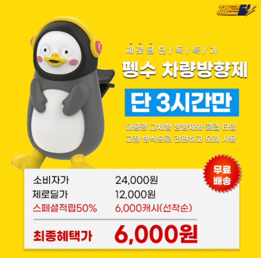 3시간 동안 진행되는 "제로딜" 타임특가에서 "펭수 차량용 마그네틱 피규어 방향제"가 12,000원 무료배송 ㅇㅇ% 할인으로 진행하고 50% 캐시적립금(6,000원)을 드립니다. 빈칸에 들어갈 숫자는 무엇일까요?