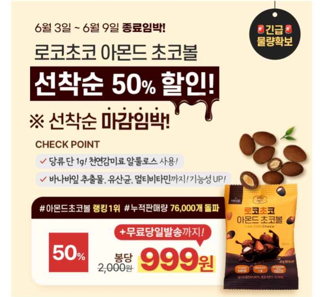 이벤트 수량이 곧 품절돼요 로코초코 아몬드 초코볼 선착순 50% 할인 & 봉당 999원!
