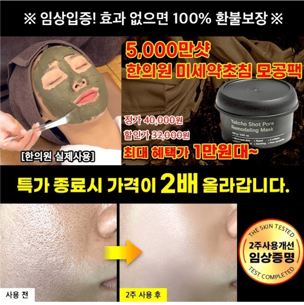 실제 한의원에서 사용되는 [성분에디터 미세약초침 모공팩]은 5000만 샷 스피큘과 한의원 비법 약초를 그대로 담은 특제 한방관리입니다.