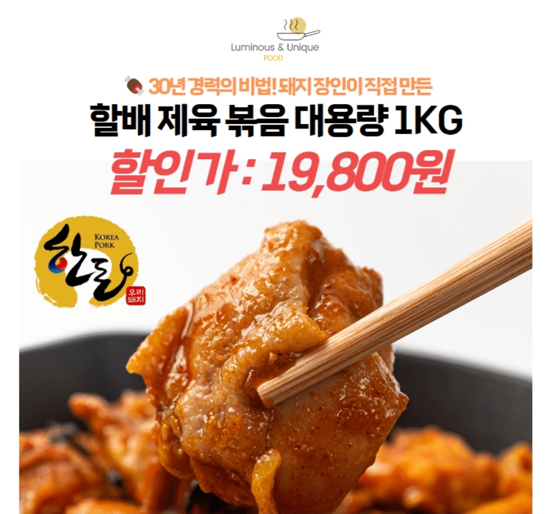 할배제육볶음 양념 국내산 한돈 수제 제육볶음은 30년 돼지장인이 손질한 1등급 000% 국내산 돼지 고기이며 맛의 기본은 원재료 기본을 충실하게 지켰습니다
