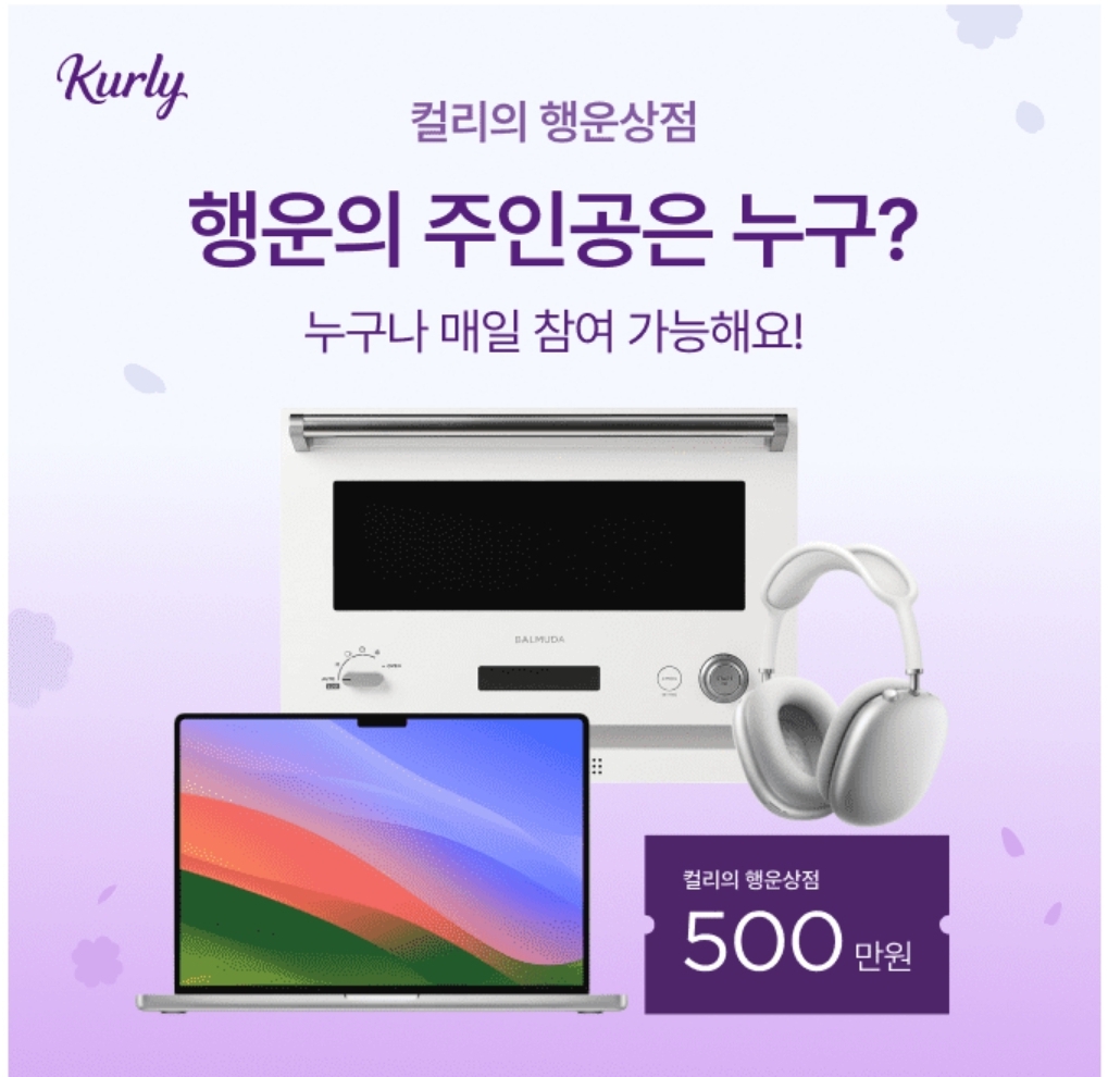 따뜻한 봄을 맞아 역대급 경품 이벤트인 컬리 행운상점이 열렸어요! 누구나,매일 참여 가능하니 지금 컬리에서 마음에 드는 경품을 골라보세요! 컬리 적립금 500만원부터 맥북프로 16인치,발뮤다 더 레인지,애플 ㅇㅇㅇ 맥스가 내 손에~!