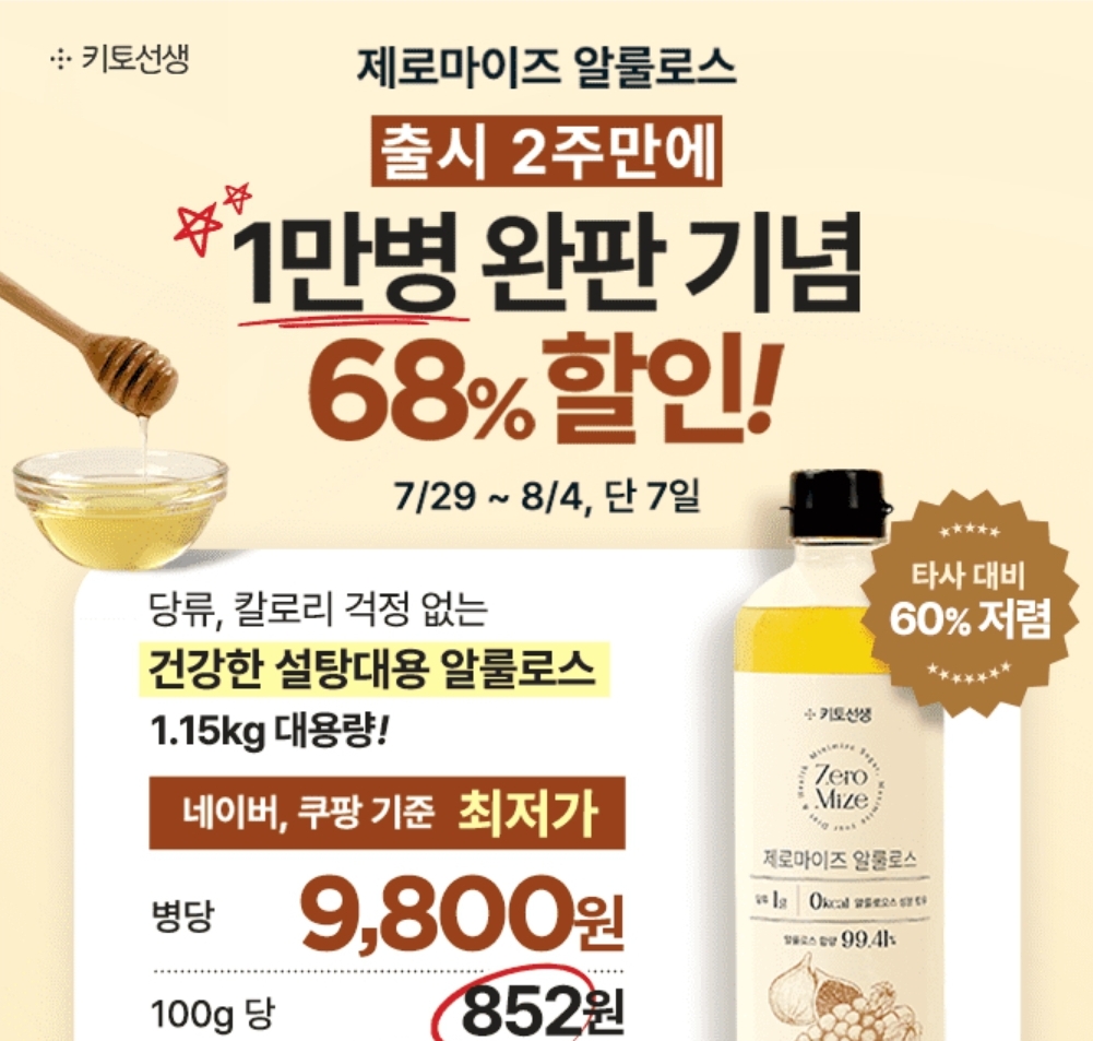 [출시 2주 만에 1만병 완판] 단 7일! 제로마이즈 알룰로스 68% 할인 이벤트! 1.15kg 대용량 알룰로스가 단돈 9,800원 & 100g당 852원!