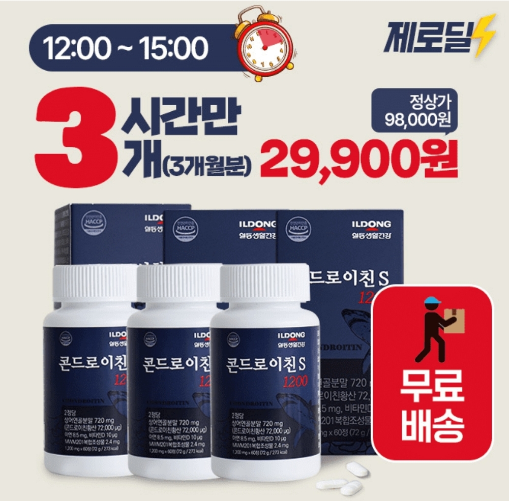 3시간 동안 진행되는 "제로딜" 타임특가에서 "1+1+1 일동 콘도로이친S 1200mg*60정(총 180정)"이 소비자가 98,000원 제로딜가 ㅇㅇㅇㅇㅇ원 무료배송 69% 할인으로 진행됩니다. 빈칸에 들어갈 숫자는 무엇일까요?
