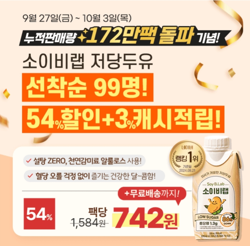 [적판매량 172만팩 돌파] 선착순 99명! 소이비랩 54% 할인 +3% 캐시적립까지! 팩당 742원 특가 찬스