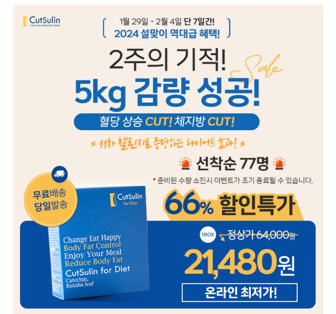 [선착순 77명] "2주의 기적, 5kg 감량 성공" 컷슬린 포 다이어트 66% 할인! 2024년 설맞이 온라인최저가 혜택