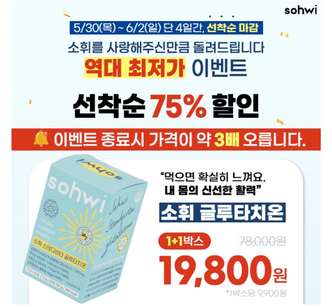 단 하루만 75% 한정혜택 52만포 전량완판! 소휘 글루타치온 분말 왜 다시 찾으시는걸까요? 이 링크에서만 수량소진시 조기종료!