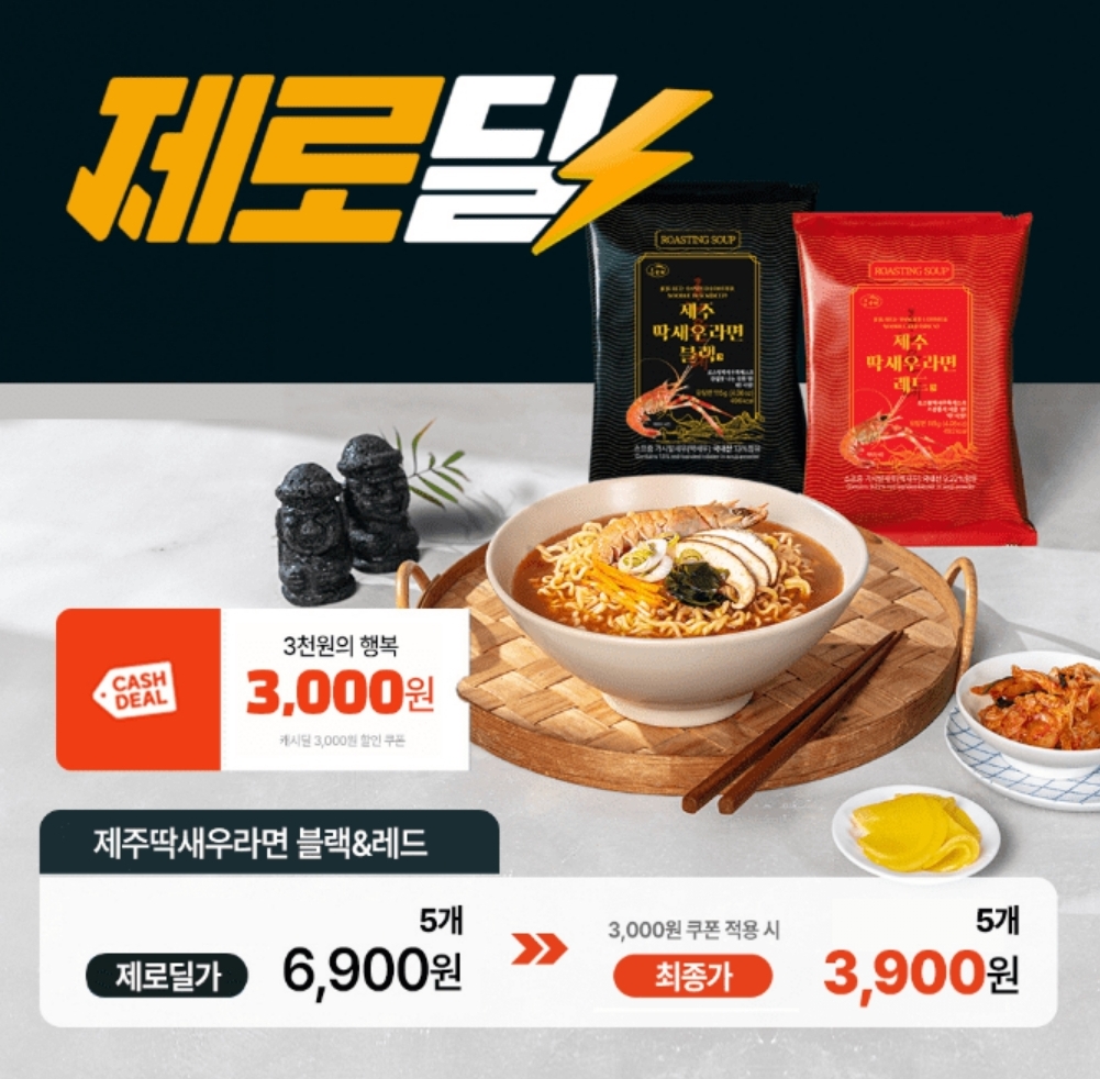 [3천원쿠폰]제주 딱새우 라면 블랙or레드 5개 캐시워크 돈버는퀴즈정답 3월 28일 목요일