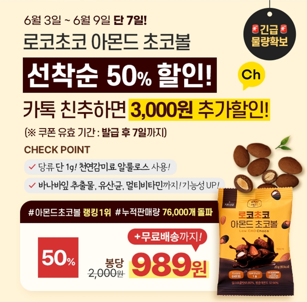 지금 바로, 톡 채널 친구만 [3,000원 추가할인] 선착순 99명 한정! 로코초코 아몬드 초코볼 50% 할인 & 봉당 989원