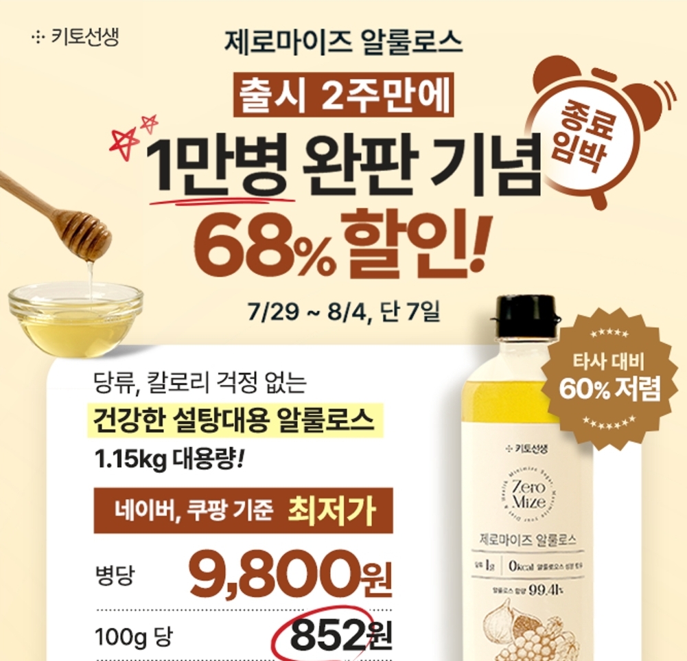 '[종료임박] 2주만에 1만병 완판 기념! 제로마이즈 알룰로스 68% 할인! 1.15kg 대용량 알룰로스 단돈 9,800원 & 시중 최저가 100g당 852원! (수량 한정)