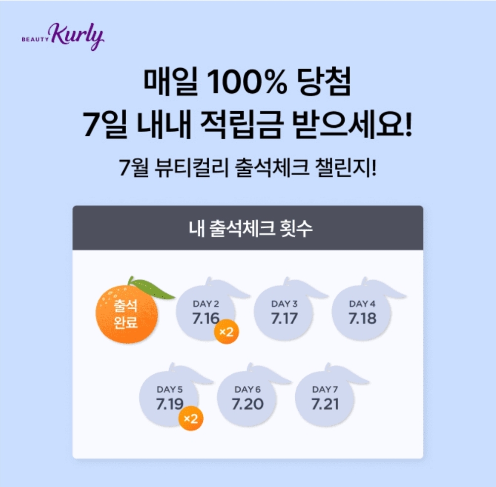 매일 100% 당첨되는 7월의 뷰티컬리 출석체크 챌린지! 참여하면 적립금을 드려요! 거기에 더해 3회 출석 시 뷰티컬리 00% 할인 쿠폰도 받을 수 있어요! 7월 15일부터 21일까지 진행하는 뷰티컬리 출석체크 챌린지 지금 참여하세요!