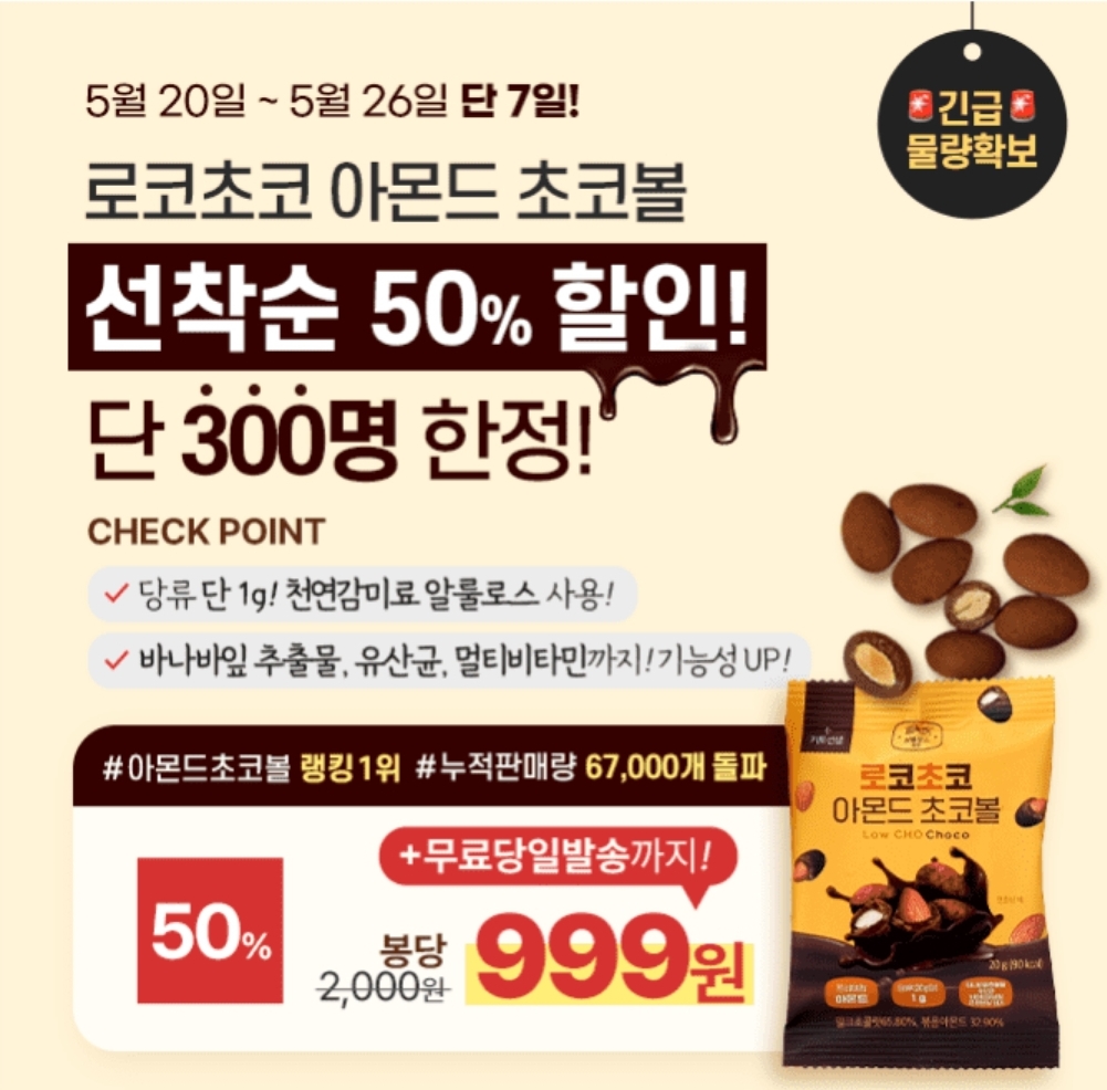 999원특가 * 당류 1g 아몬드초코볼 선착순 50%