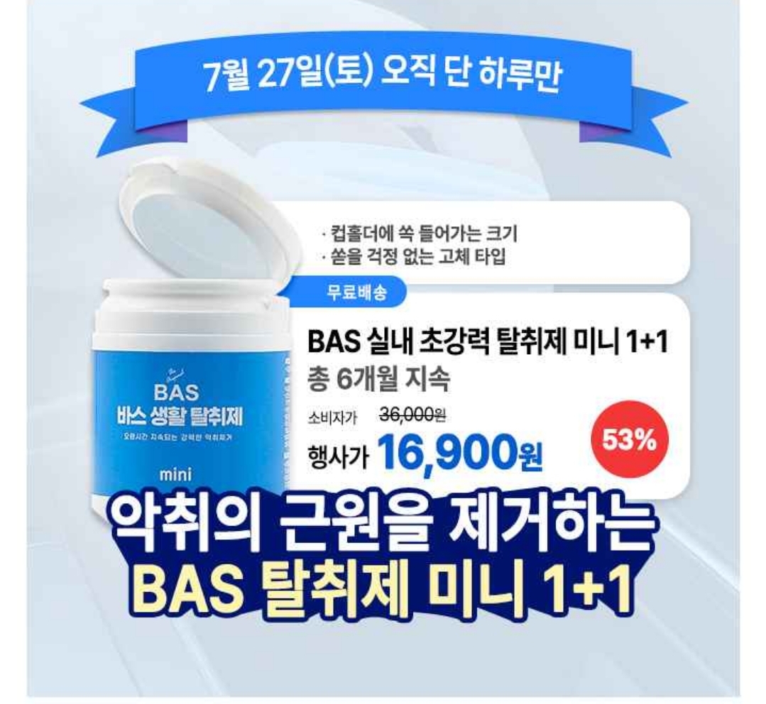 오늘 단 하루만 1+1 53% 초특가 할인! 용량이 큰 탈취제는 움직이는 차량 안에서 사용하기 정말 어려룸이 많은데요 BAS 탈취제는 000에 쏙 들어가는 크기로 차량용으로 사용하기 좋습니다. 000은 무엇일까요?