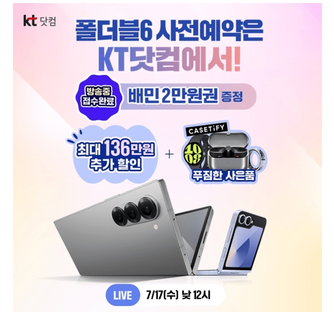 KT닷컴 갤럭시 폴더블6 사전예약 OPEN 00은 인크레더블 얼마남지 않은 사전예약 혜택 기회 폴더블6 구매하면 워치7 증정+사전예약만 해 도 배민 2만원권 증정!