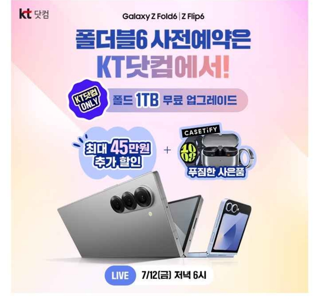 KT닷컴 000 폴더블6 사전예약 라방 보고 사전예약 해야하는 이유가 궁금하시다면? 어마어마한 혜택을 지금 바로 확인하세요! 라방 단독 접수만 하면 배민 2만원권까지!