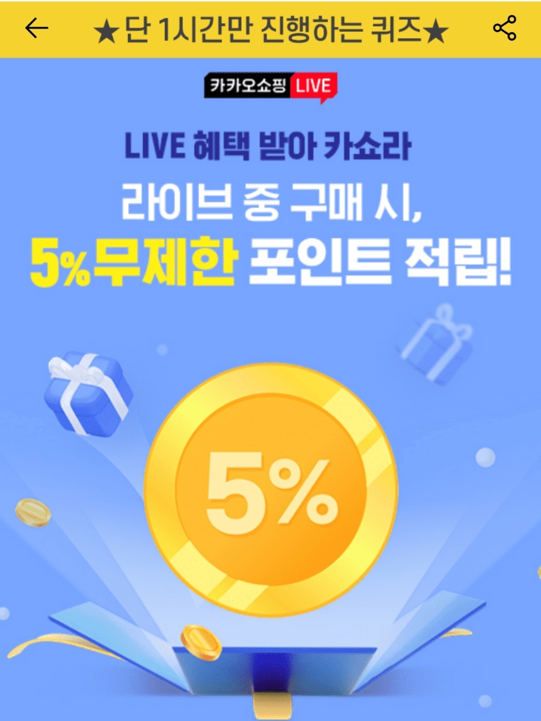 지금 카카오쇼핑라이브에서는 라이브 중 구매하면 무제한으로 5% 포인트 적립을 해주는 이벤트를 진행 중이다 이번 이벤트에는 송쭈집 쭈꾸미볶음 마시는 0000 요거트, 여름철 냉감 쿨매트, 세부 힐링여행 패키지, 피토틱스 이노시톨 등의 라이브가 참여한다. 빈칸에 들어갈 단어로 알맞은 것은?